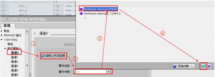 4、在 CPU 属性窗口中关联硬件中断事件,如下图所示,分别将 I0.0 和 OB40 关联,I0.1 和 OB41 关联。如图5、6。