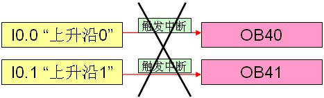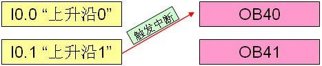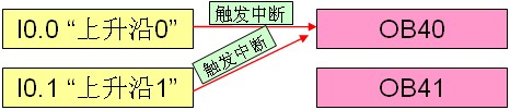 例如:当硬件输入 I0.0 上升沿时,触发硬件中断 OB40(执行累加程序),当硬件输入 I0.1 上升沿时,触发硬件中断 OB41(执行递减程序),硬件中断事件和硬件中断 OB 关系如图1。