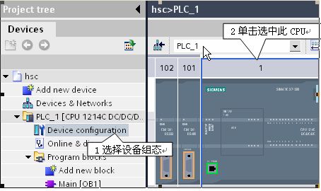 针对此应用,选择CPU 1214C,高速计数器为:HSC1。模式为:单相计数,内部方向控制,无外部复位。据此,脉冲输入应接入I0.0,使用HSC1的预置值中断(CV=RV)功能实现此应用。