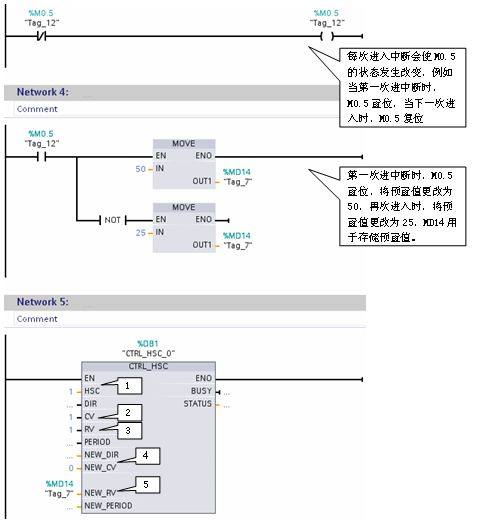假设在旋转机械上有单相增量编码器作为反馈,接入到S7-1200 CPU,要求在计数25个脉冲时,计数器复位,置位 M0.5,并设定新预置值为50个脉冲,当计满50个脉冲后复位M0.5,并将预置值再设为25,周而复始执行此功能。