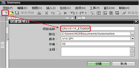 - 点击“新建项目”输入项目名称(CPU1511F_ET200SP)点击“OK”,完成项目创建, 如图2-1所示。