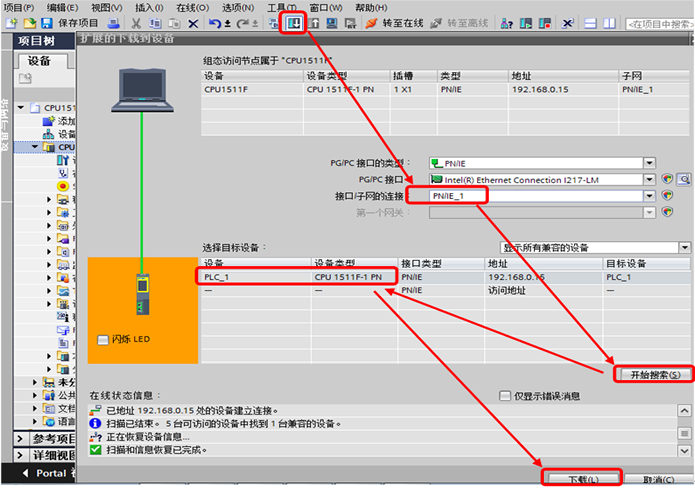 PN/IE_1,点击“开始搜索”按钮,在“选择目标设备”中选中已找到设备,点击“下载”按钮进行硬件组态下载,如图2-120示。
