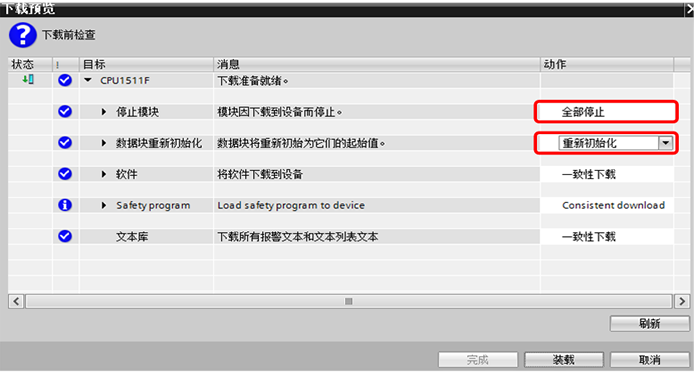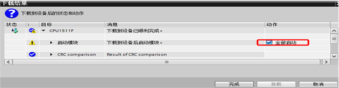 在弹出的下载预览窗口中,选择“全部停止”动作,点击“装载”按钮,勾选“全部启动”选项,点击“完成”后CPU将进入RUN模式,如图2-11/12示。