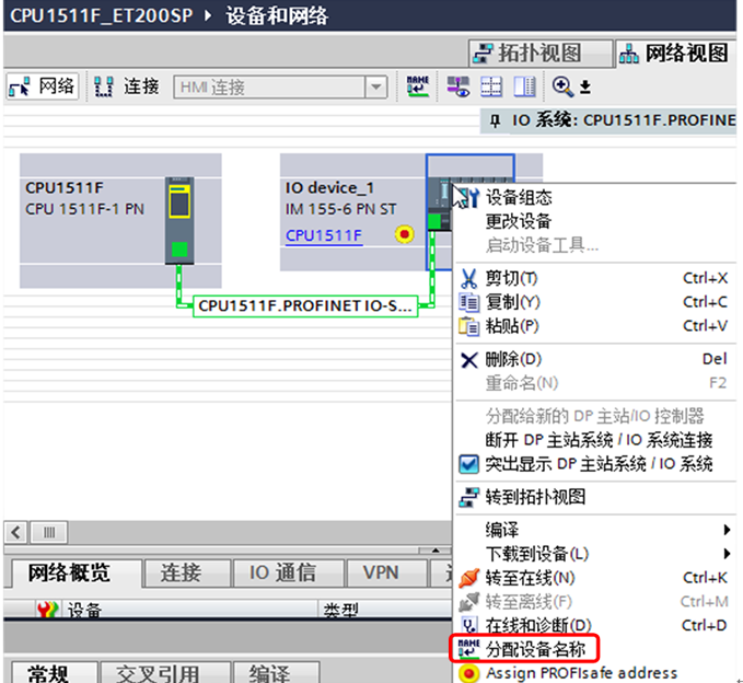 IO通信建立之前需要分配ET200S站点的设备名称,首先在网络视图中选中IM155-6站点,点击鼠标右键中“分配设备名称”,如图2-13所示。