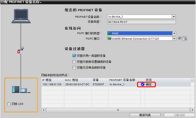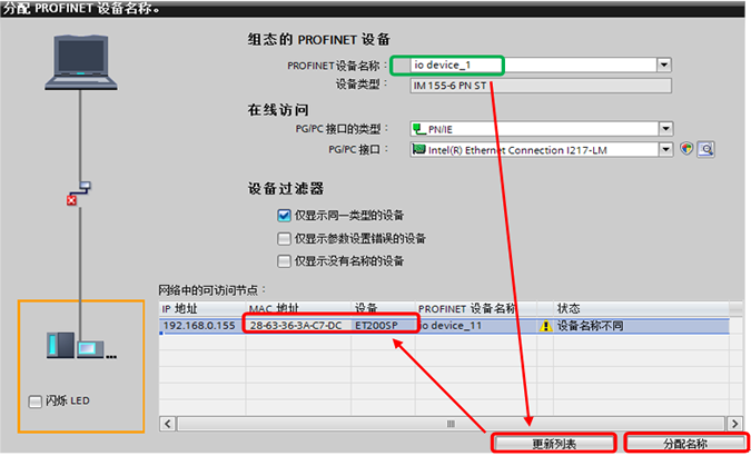 device_1”(图2-8中绿色方框为IM155-6PN的设备名称),点击“更新列表”按钮,然后选中目标设备的MAC地址,点击“分配名称”按钮即可,如图2-14/15所示。