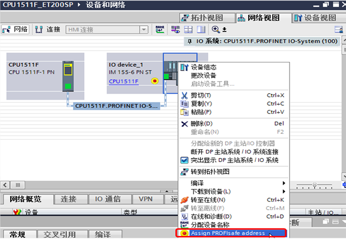 - 分配完设备名称后,CPU1511F与ET200SP站点的PROFINET通信建立,接下来需要在线分配安全模块F目标地址。首先在网络视图中选中IM155站点,点击鼠标右键中“分配Profisafe地址”,如图2-16所示。