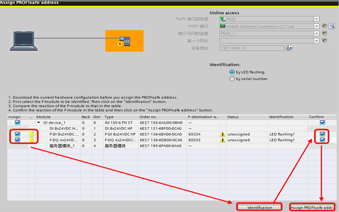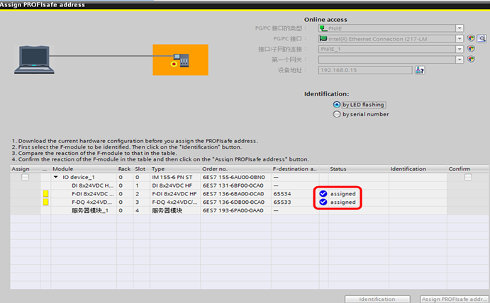 在弹出的新对话框中,勾选带有黄色标签的安全模块,点击“Identification”按钮,这时相应模块上的所以指示灯一起闪烁,确认没有错误后勾选右侧确认的框,点击“Assign PROFIsafe addr...”按钮。分配成功后,安全模块状态栏显示‘Assigned’,如图2-17/18所示。
