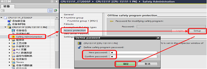 - 在项目树中双击“Safety Administration”功能,在右侧页面中使能安全密码保护并设置安全程序密码,如图2-3所示。