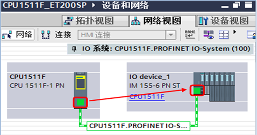 拖拽CPU1511F的以太网口到IM155-6 PN的以太网口,建立网络连接,如图2-7所示。
