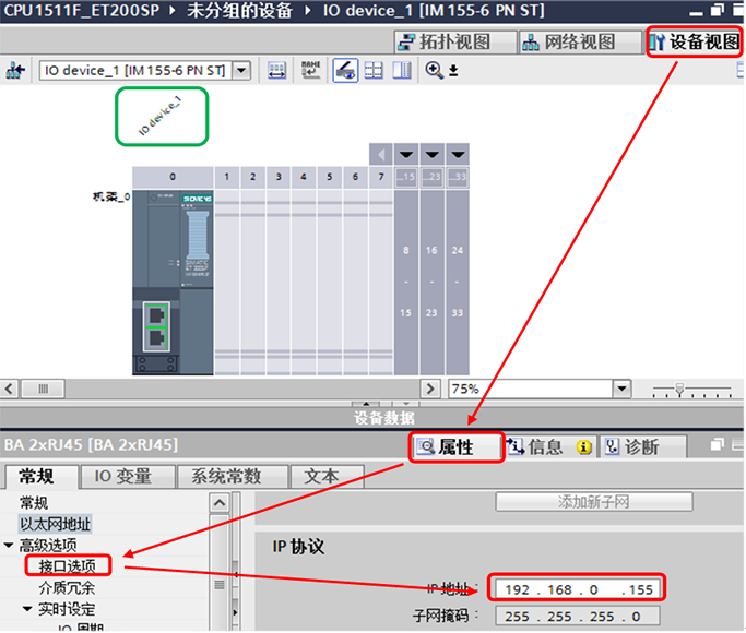 - 为IM155-6 PN分配IP 地址,首先在上图中双击IM155站点进入设备视图,在属性页面中点击“以太网地址”选项,在右侧页面中修改IP地址为“192.168.0.155”,如图2-8所示。(绿色方框中的名称作为后面章节要用到的ET200SP站 Device Name)
