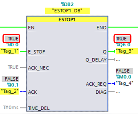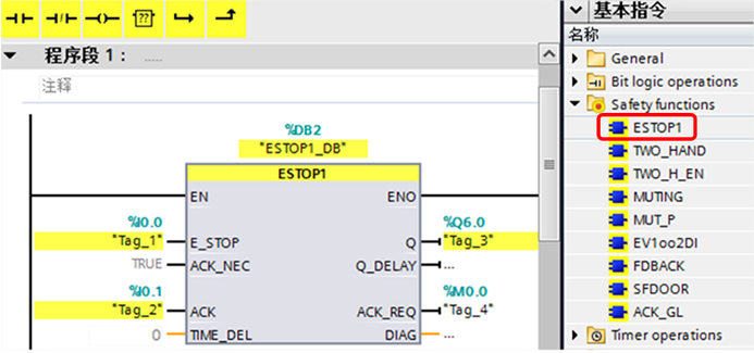 - 打开安全主程序块FB1,在右侧安全功能库中调用ESTOP1急停功能块,E_STOP输入管脚填写急停开关的硬件地址I0.0,ACK管脚填写故障复位开关的硬件地址I0.1,Q管脚填写Q6.0,ACK_REQ为请求复位状态,分配地址M0.0进行监控,如图3-2所示。