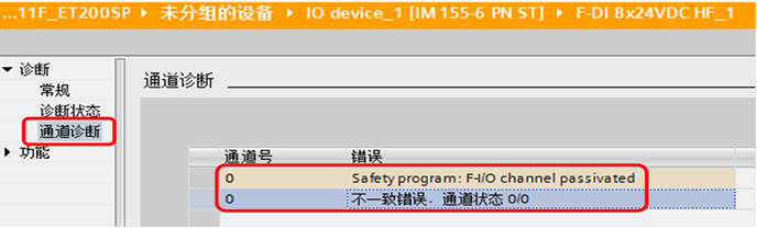 就是一个双通道1oo2评估的急停按钮其中一路信号断线后模块诊断缓冲区的信息。安全输入模块检测到通道差异错误,具体通道号0和模板钝化,此时安全模块SF指示灯会变亮,安全程序中输入地址状态变为0(保持安全值输入)。