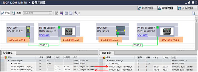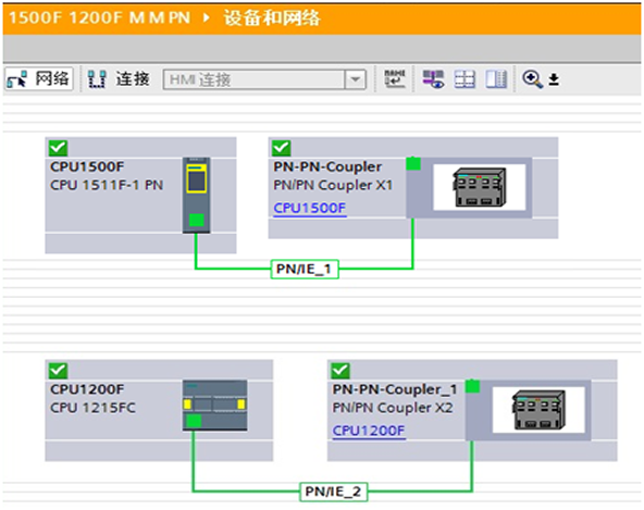 在本例程中,将CPU1511F-1PN作为一个PROFINET 控制器,CPU1215FC作为另一个PROFINET 控制器,通过PN/PN Coupler实现两个CPU的安全相关的通信。