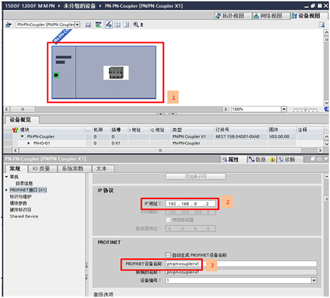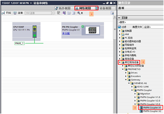在“网络视图”中,组态PN/PN Coupler X1,如图2-4。