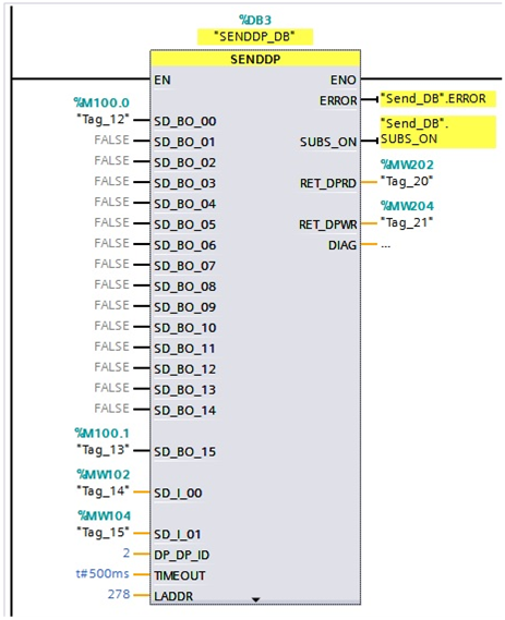 注意:输出变量中,除“RET_DPRD”,“RET_DPWR”和“DIAG”三个变量以外其它的变量都需要用故障安全的数据连接。图3-7 SENDDP中LADDR管脚