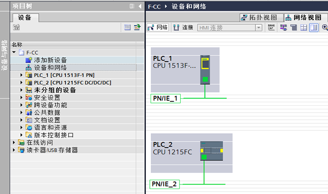 本示例中CPU151F设备名称是PLC_1,CPU1215FC设备名称是PLC_2。如图 1 所示。图 1 在新项目中创建两个PLC 站