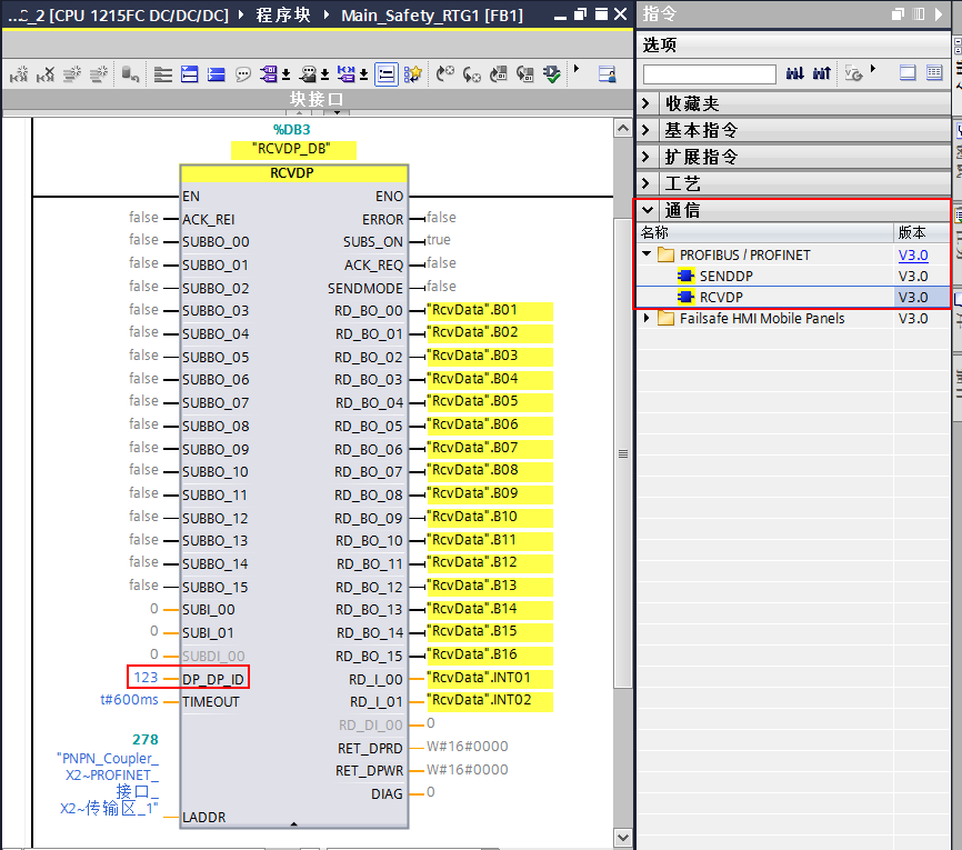 图 18 CPU1215FC中的接收功能块DP_DP_ID要与CPU1513F中的发送功能块一致