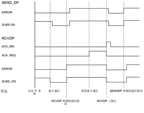 接收方(RCVDP 指令)会将输入参数 SUBBO_xx 和 SUBI_xx 或 SUBDI_00所指定的故障安全值替代到对应输出,同时置位输出ERROR和 SUBS_ON =1,在输出参数DIAG处显示有关所发生通信错误类型的信息。