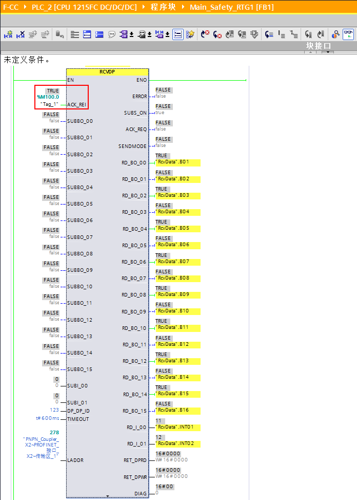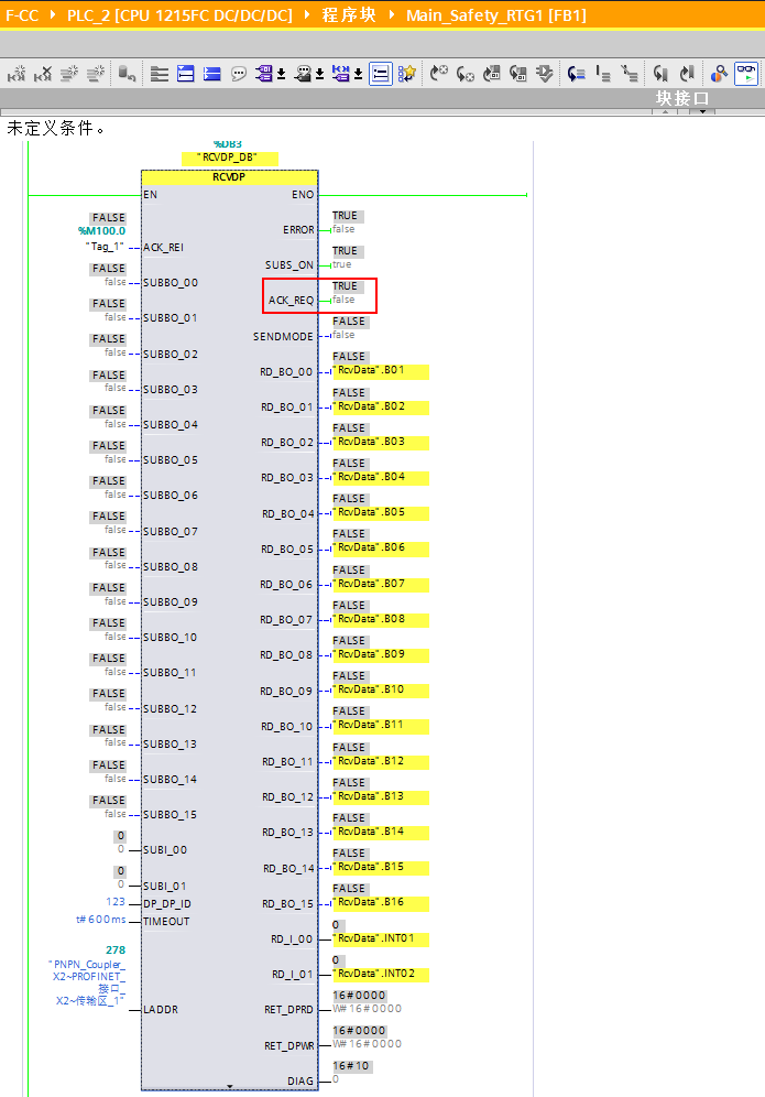 当不再检测到通信错误时,RCVDP 指令会置位输出参数ACK_REQ = 1,这时在输入参数 ACK_REI 处输入上升沿进行确认,安全数据传递才会恢复。