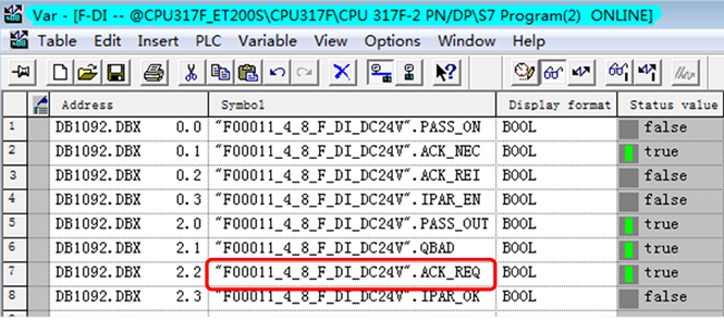 当导致安全模块钝化的故障修复后,对应F-IO DB中的请求应答信号ACK_REQ变为1,表示故障已经解除请求去钝,如图3、图4所示。