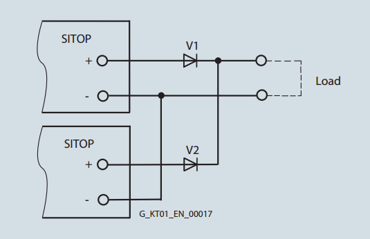注意:任意两台同型号的SITOP 24V直流电源都支持通过冗余模块或解耦二极管并联来实现冗余运行。