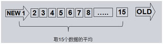Depth of average value filter:平均值滤波深度,默认15。称重模块内部的采样周期为20ms或33ms,默认为20ms。比如平均值滤波设置为15,表示15个采样值进行平均作为最终的测量结果,每隔20ms最早的采样数据被剔出,新的采样值参与平均(如下图所示),可以去除低频干扰和周期性干扰。