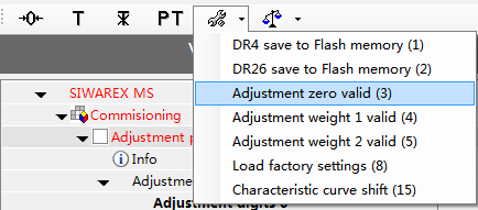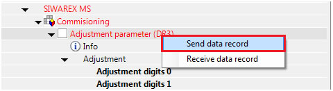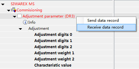完成上述参数设置后,将鼠标点击Adjustment parameter (DR3)上,鼠标右键,选择Send data record,将DR3中的所有参数写入到称重模块中。