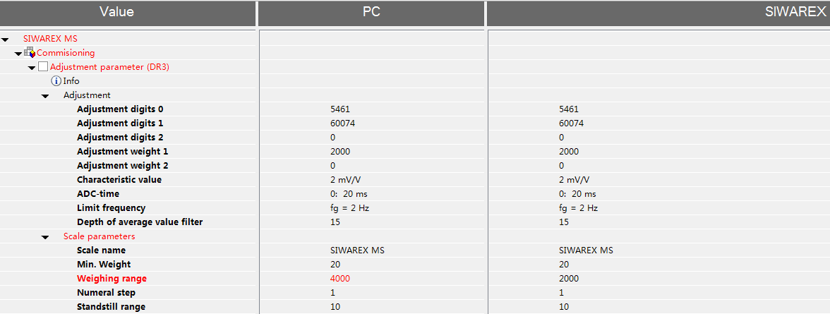 PC列参数表示SIWATOOL软件中的参数设置,SIWAREX列为称重模块内实际设置的参数,当二者不一致时,参数为红色。