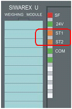 SIWAREX U上的两个LED指示灯ST1和ST2,如下图所示。新的称重模块初次上电时会发现ST2为橙色,具体原因参考“SIWAREX U第一次上电,SF灯和ST2灯亮”
