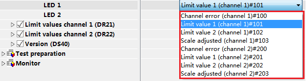 ST1和ST2指示灯的功能可以由用户定义,默认情况下LED1为通道1的上限报警,LED2通道1的下限报警,如下图所示: