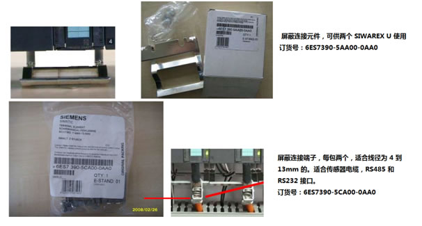(6) 为最大程度降低干扰对测量的影响,传感器屏蔽层通过专用屏蔽元件与安装导轨连接,屏蔽连接元件6ES7390-5AA00-0AA0和屏蔽连接端子6ES7390-5CA00-0AA0 如下图所示。