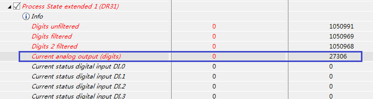 4-20mA在称重模块内转化为数字量0至54612,当前电流输出对应的数字量可以在DR31中查看,如下图所示,当前数字量为27306,刚好是54612的一半,所以当前电流是12mA