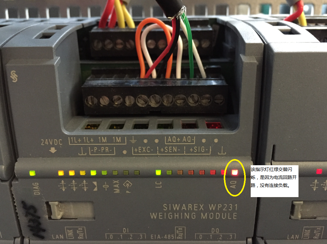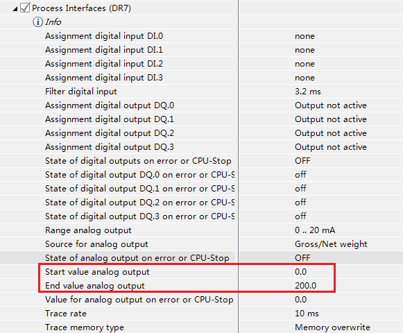 如果DR7中设置了4-20mA对应的量程范围(默认设置为0) ,如下图所示,即4-20mA对应重量为0-200kg,此时电流输出激活,如果电流回路没有连接负载,处于开路状态,那么AQ指示灯会黄绿交替闪烁。
