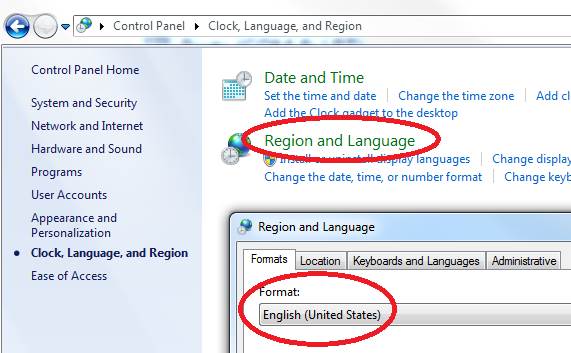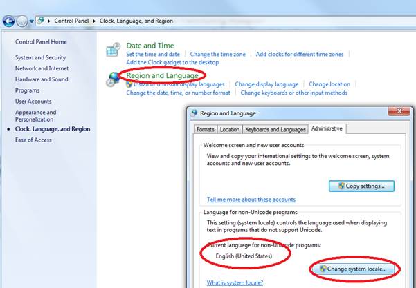 第一步:设置系统语言为English,在控制面板中完成下列设置: