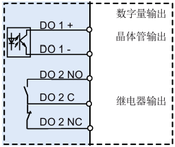 数字量输出的接线方式,晶体管和继电器输出带载特性如下: