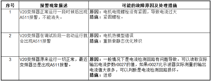 报警名称:电机过温。当根据电机热模型计算出的电机温度值达到P0604(默认是130℃)中定义的报警阀值时,变频器显示报警A511.