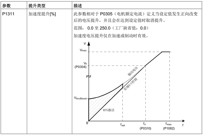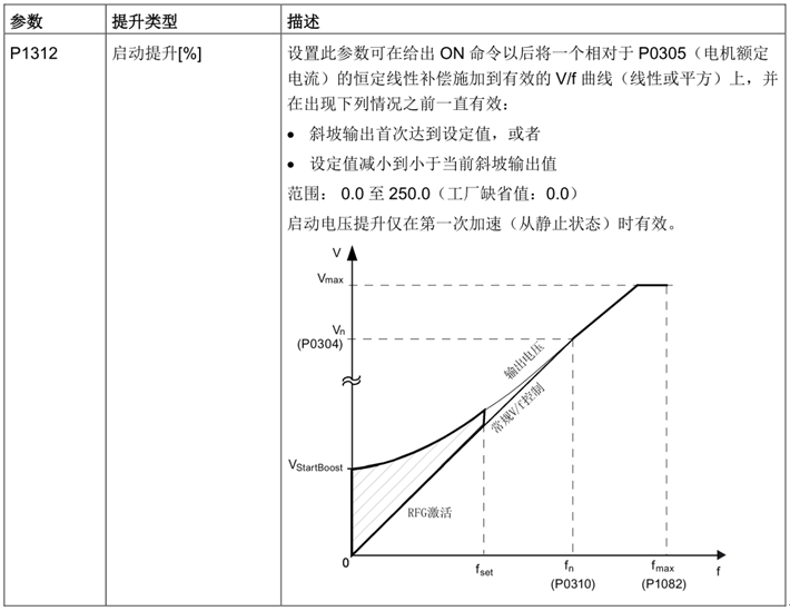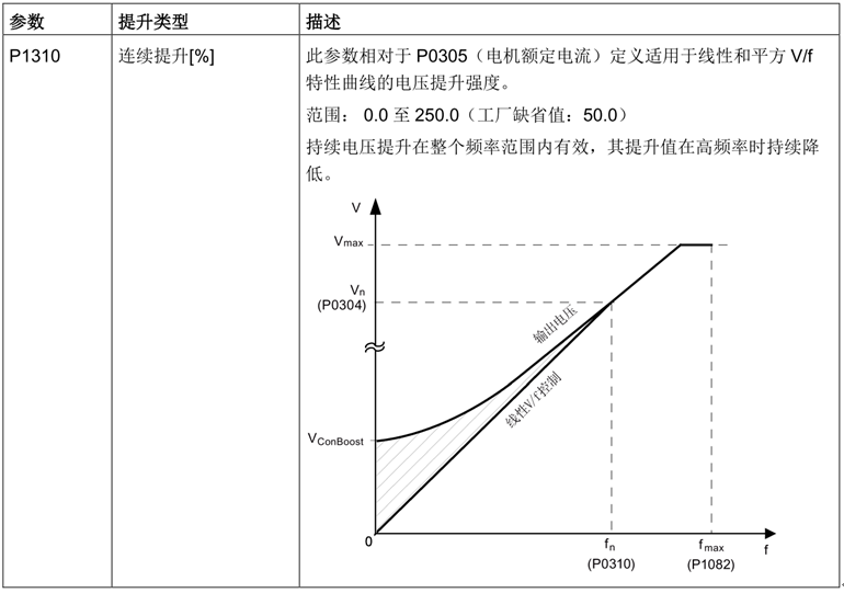 针对高起动力矩、短时过载优化控制特性,可以通过设置下表中的参数可以增大(提升)变频器的输出电压。