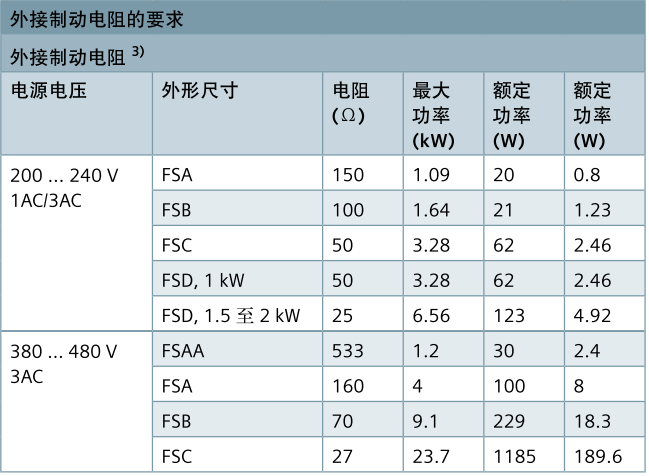V90所有的驱动模块(200V,额定功率0.1KW的型号无内置制动电阻)都集成了内置制动电阻,可消耗掉再生的能量以确保驱动系统能够快速停止。不需要外加的制动电阻即可满足大部分的应用。当内部制动电阻容量不足以吸收再生能量时可使用外部制动电阻。