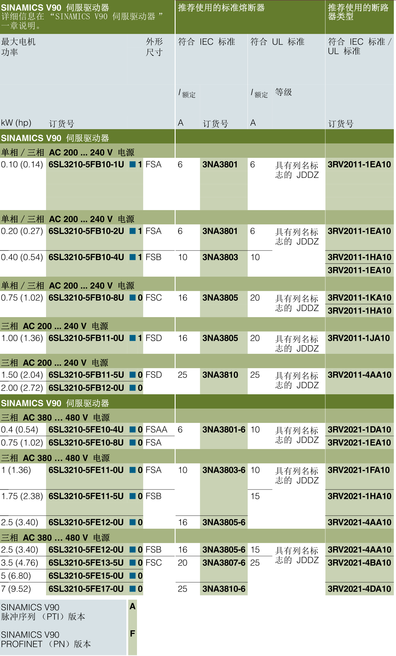 保护熔断器及断路器(推荐使用的进线侧过电流保护装置)