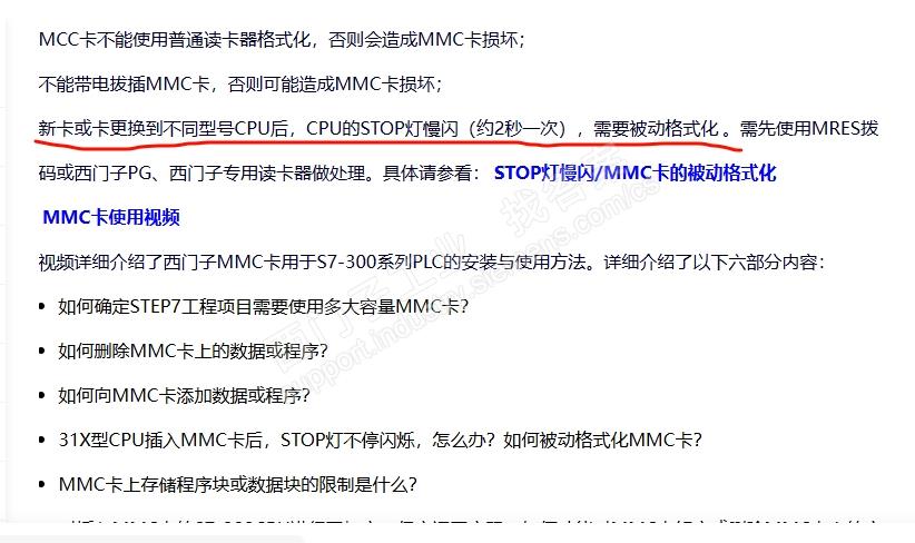 此外,严禁使用普通读卡器对MMC卡进行格式化,否则会导致卡片损坏。如需彻底清除数据,建议使用西门子专用编程器PG或USB读卡器进行处理