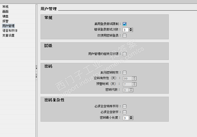 打开博途 触摸屏 左侧菜单,最底下有个用户管理,在里面建立用户,设定用户名和密码!