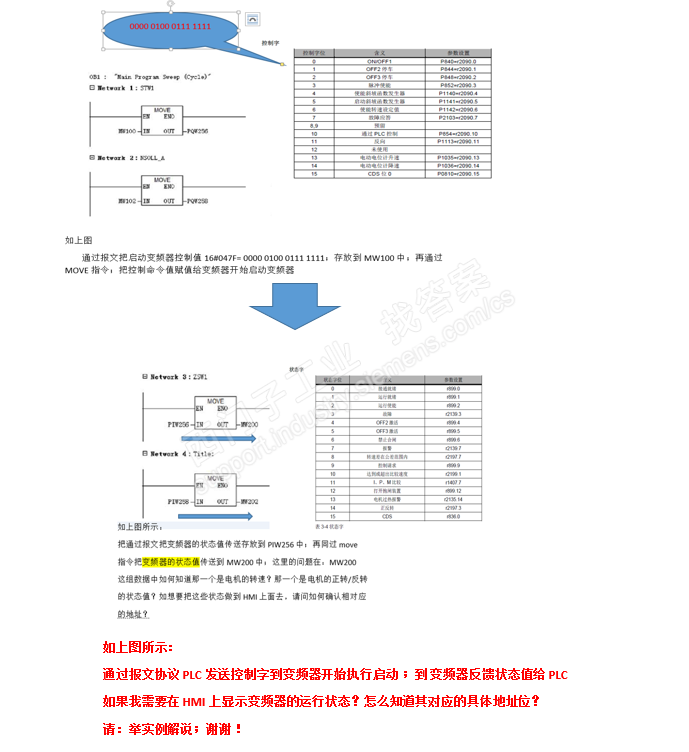 假设,M200.7是变频器故障信号位值,那么,你可以在触摸屏做报警组态或者直接组态一个故障指示灯,来显示变频器的运行状态。