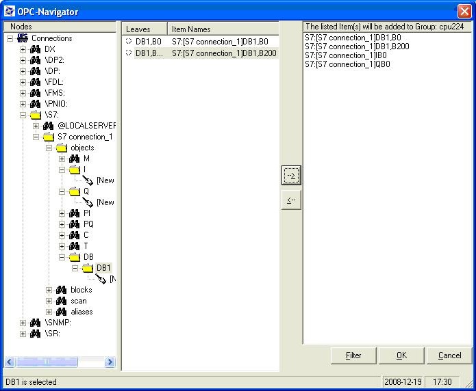 双击生成的连接组“cpu224”打开OPC-Navigator,选择“S7”协议,自动显示已组态的S7 connection_1,点击“objects”显示所有通讯数据区,以I/M/Q/DB为例创建通讯数据,如下图2.4.20,图2.4.21,图2.4.22点击“→”将条目移送到右侧窗口,点击“OK”,如通讯正常,则在图2.2.24 中“Quality”一栏中显示为“good”