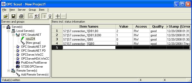 在OPC Scout中对应DB变量接收无误,如图2.4.24,DB1.DBB200和DB1.DBB0