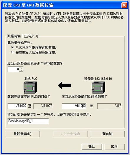 在客户机属性里面,我们还需要进一步配置数据传输。以上图为例,客户机要从服务器192.168.0.1的CP 243-1模块里面读到8个字节的数据,数据源的地址是VB1000,数据本地的地址也是VB1000,我们使用默认的数据连接名称。每个数据交换最多允许配置212个字节,每个连接最多可以配置32个数据传输。
