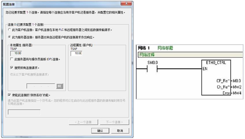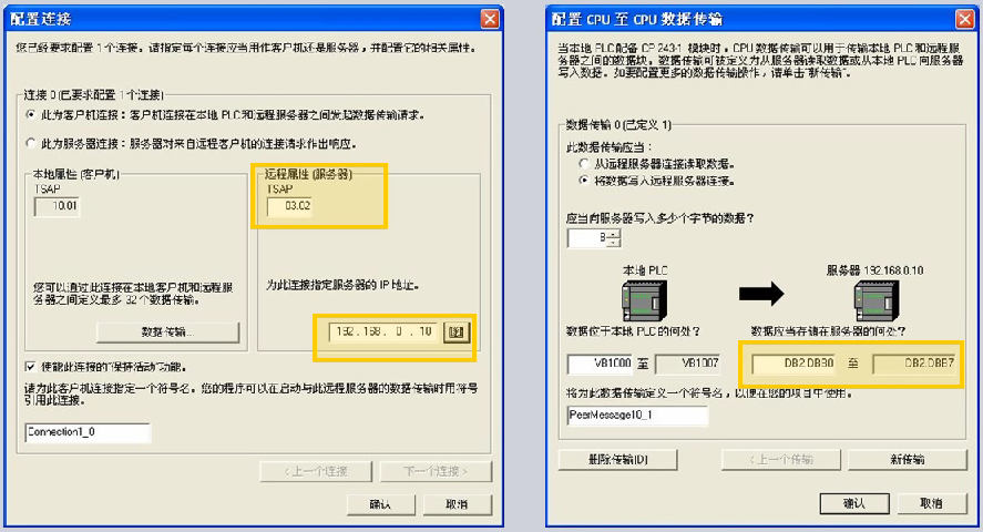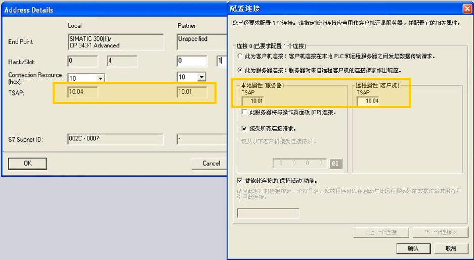 上图中介绍的是客户机和服务器的两个截图,我们先看左边的服务器的配置。如果将CP 243-1选为服务器连接,可以看到我们需要填写的是远程的TSAP的端口号,同时我们如果勾选上"接受所有连接请求",下面客户机的IP地址就为灰,我们就不必再填写了,另外可以保持默认勾选的"保持活动"连接功能。接下来再看客户机的配置,两个CP 243-1的向导配置里面"本地属性"和"远程属性"需要交叉对应,也就是如上图中所示的服务器端CP 243-1向导里面的远程TSAP端口号必须和远程的客户机端的本地端口号一致,同理,服务器端的本地的TASP编号必须和客户机端的远程的客户机编号一致,同时服务器的IP地址要填写到客户机端。