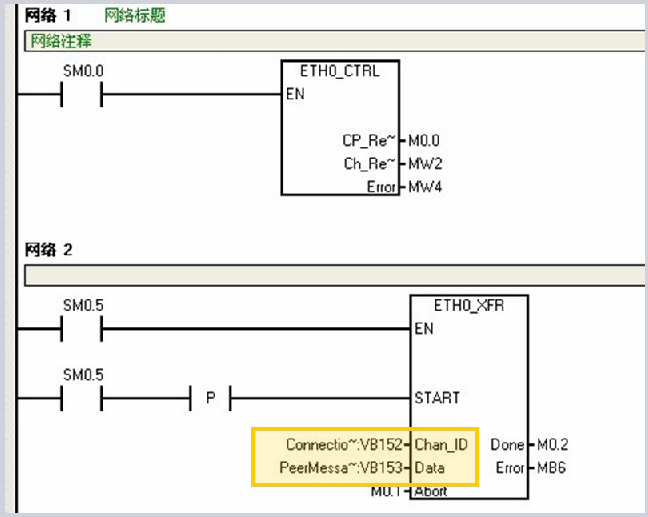 两边的以太网向导配置完成之后需要在各自的主程序里面调用以太网向导生成的子程序,在服务器这端我们只需要用SM0.0去激活ETH0_CTRL这个子程序,在客户机端除了调用ETH0_CTRL这个子程序之外我们还需要调用ETH0_XFR子程序去实现实际的数值交换。在上图的例子里面我们可以看到,XFR的使能端是SM0.5,是一个秒脉冲地址,并且使用SM0.5的上升沿作为START触发,Chan_ID和Data所填的地址或符号名我们可以在向导所生成的符号表里面看到,或者在向导里面的对应配置的标签下面可以看到。我们需要注意的是,在同一个连接下面不能有多个数据传输同时激活。