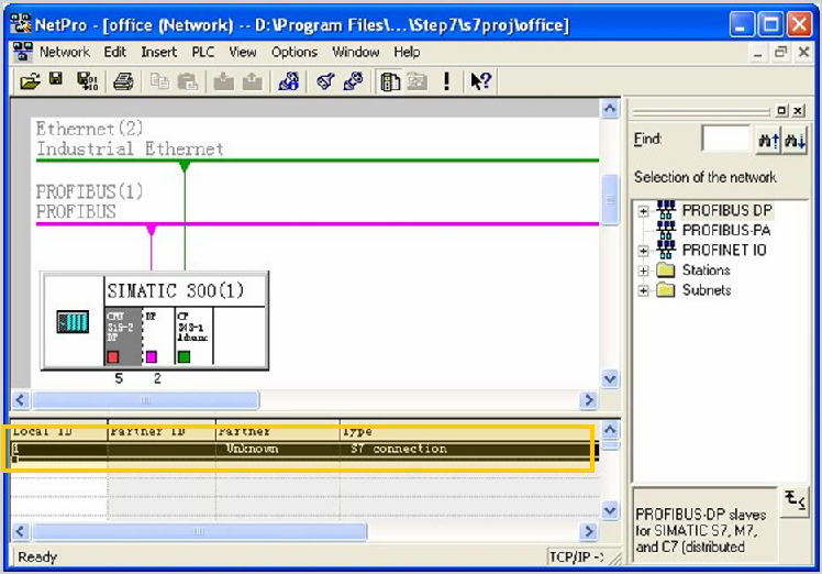 首先,做完标准的硬件组态之后我们需要在网络组态里面添加一个S7连接(如上图);