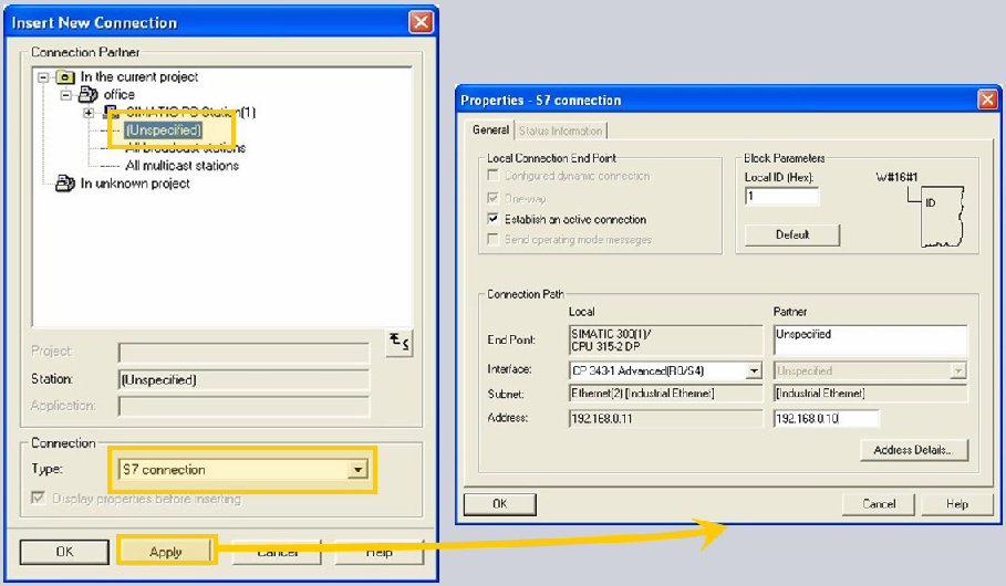 在S7连接里面我们先要选择这是一个通讯伙伴位指令的连接,连接类型为S7连接,在连接的属性里面我们可以看到远程的IP地址,也就是我们CP243-1的IP地址我们填写192.168.0.10;