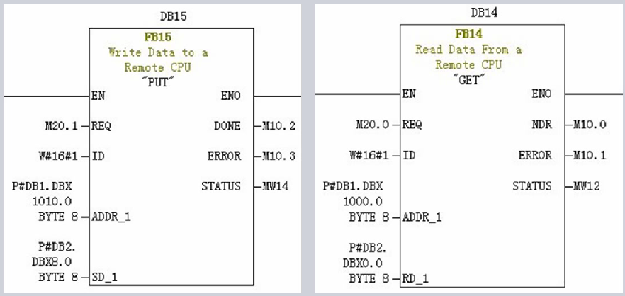 组态完毕后我们打开S7-300的OB1主程序,在这里面调用FB14和FB15两个通讯指令,两个功能块的REQ是触发端,每次捕捉到1信号后都会执行一次GET或者PUT通讯操作;"ID"是指在网络组态里面连接属性里面看到的连接ID,在本应用中我们填写1;"ADDR_1"指的是远程的CP243-1里面的数据地址,在这里面CP243-1背后的S7-200的V存储区一律被S7-300识别成DB1,在这里面我们PUT功能块填写的P#DB1.DBX1010.0 BYTE 8代表的是从VB1010开始的地址,8个连续的字节;"SD_1"和"RD_1"代表的是S7-300本地的数据存储区地址,我们这里面新建了一个DB2作为通讯缓冲区。